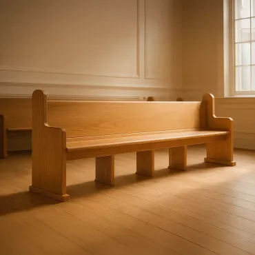 Banco de igreja em madeira, desenvolvido para compor projetos arquitetônicos de templos, capelas, auditórios e espaços cerimoniais. A peça apresenta linhas tradicionais, assento corrido e apoios laterais característicos, trazendo realismo e fidelidade estética para ambientes religiosos e institucionais.
