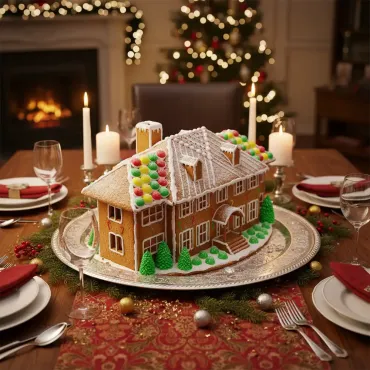 Sinônimos: Casa de biscoito de gengibre, casa de biscoito, modelo de casa de gengibre, peça decorativa de Natal, item de decoração festiva, objeto temático natalino.