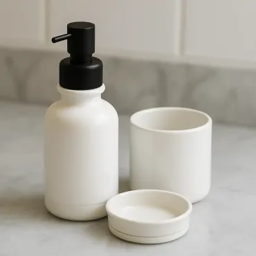 Conjunto composto por dispenser para sabonete líquido, recipiente cilíndrico e saboneteira em cerâmica, ideal para organizar e humanizar bancadas de banheiros, lavabos e áreas de higienização. A composição adiciona sutileza, funcionalidade e realismo às visualizações arquitetônicas, mantendo uma estética minimalista e contemporânea.