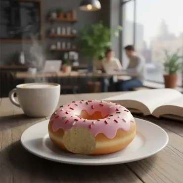 • Destaque Visual: O detalhe do "donut mordido" oferece um ponto focal interessante, sugerindo uso e atividade no ambiente projetado.