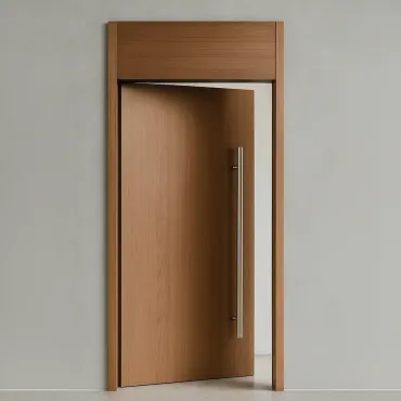 Família BIM desenvolvida para Autodesk Revit 2024, representando uma porta de madeira pivotante com bandeira superior, ideal para projetos residenciais, comerciais e institucionais. O modelo inclui puxador alongado e segue proporções realistas para aplicação em modelos arquitetônicos detalhados.
