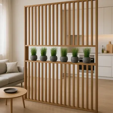 Separador de ambientes em madeira, composto por estrutura ripada vertical e prateleira central com vasos decorativos. Este elemento é ideal para dividir espaços de forma leve, mantendo continuidade visual e proporcionando harmonia entre áreas integradas em projetos residenciais e comerciais.