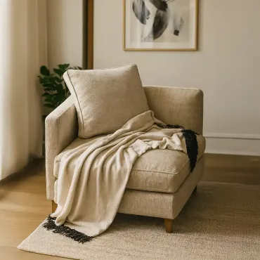 Sofá estofado de um assento com manta decorativa apoiada sobre a superfície, ideal para compor espaços acolhedores e contemporâneos. A presença da manta adiciona camadas visuais e transmite sensação de conforto, contribuindo para uma ambientação equilibrada e sofisticada em propostas de interiores residenciais e comerciais.
