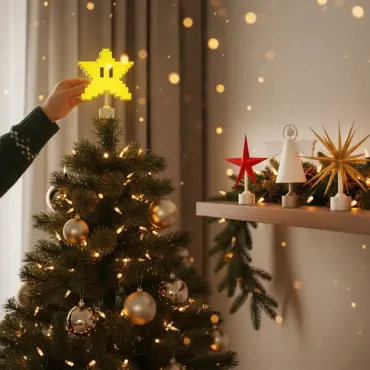 • Diversidade de Designs: A família oferece vários modelos, incluindo a clássica estrela de ponteira, um anjo para topo e um design lúdico de estrela pixelizada, adaptando-se a diferentes estilos de projeto.