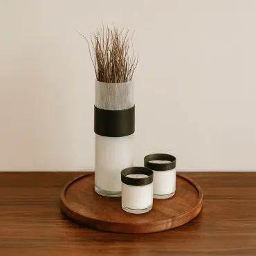 Conjunto decorativo composto por um vaso cilíndrico com vegetação seca, acompanhado de duas velas em recipientes de vidro, todos dispostos sobre uma tábua circular de madeira. Elemento ideal para humanizar projetos e adicionar detalhes realistas em ambientes residenciais, comerciais e corporativos.