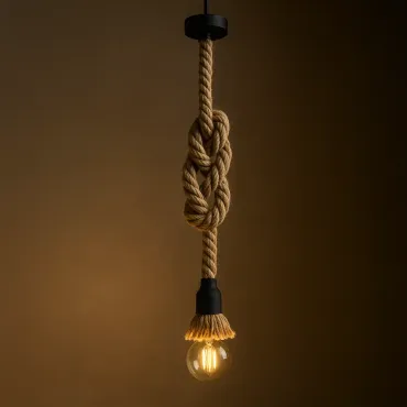 Pendente rústico confeccionado em corda grossa, com dois nós decorativos e suporte para uma lâmpada. Esse elemento valoriza ambientes com estilo industrial, retrô ou natural, oferecendo um toque artesanal e diferenciado na iluminação de projetos residenciais e comerciais.
